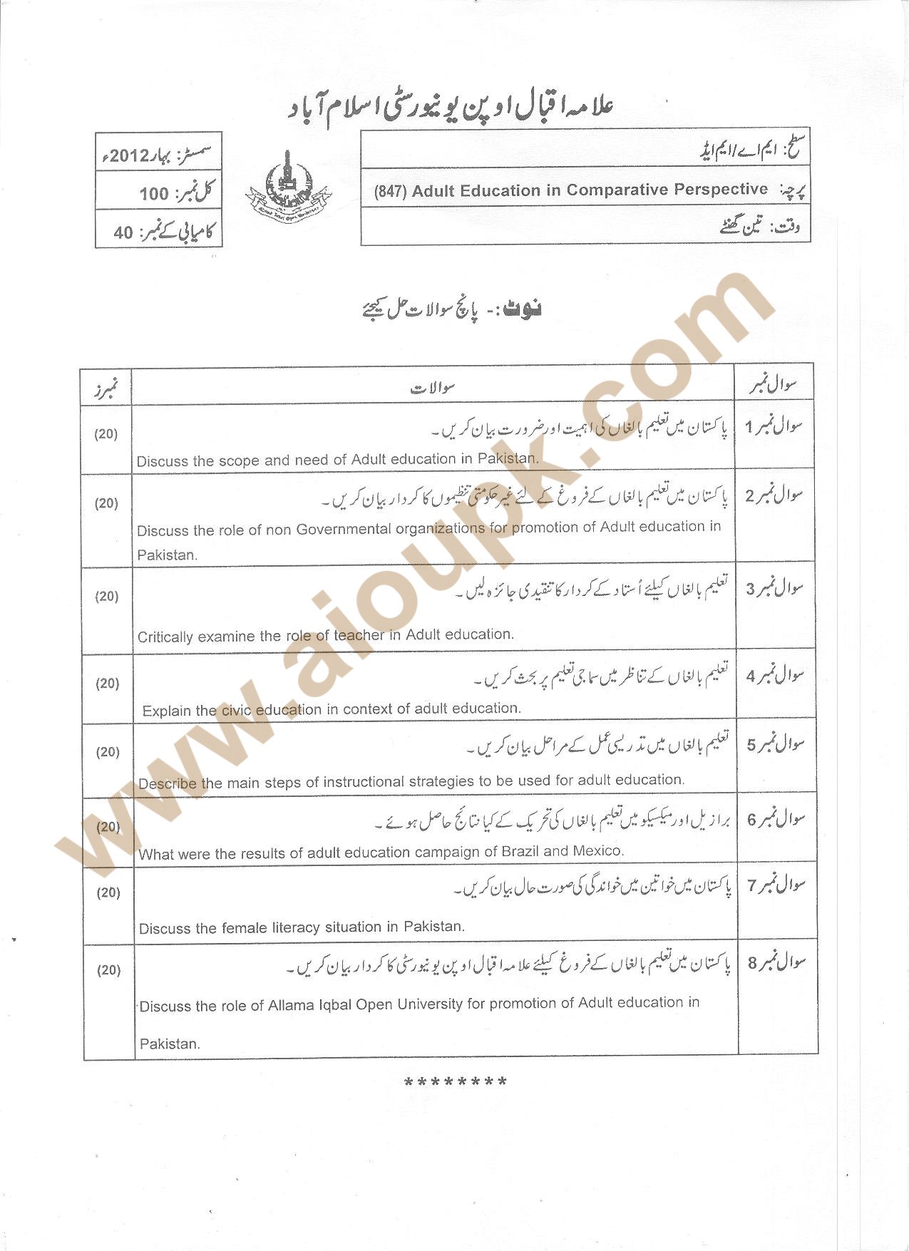 Past Papers Collection of Post Graduate Programs of AIOU (Allama Iqbal Open University, Pk)