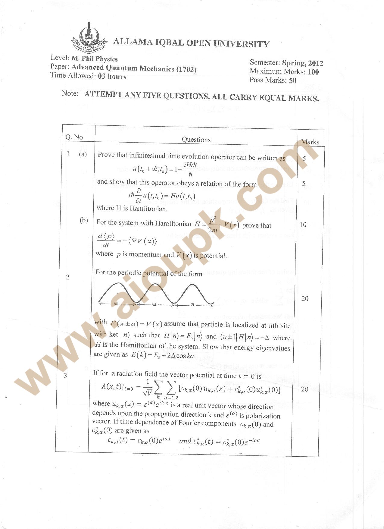 There are two pages of the given course paper, you can use it as a pattern / guess paper. It is Master in Science (M.Sc) level program offered by University. Best of Luck for your Exam.