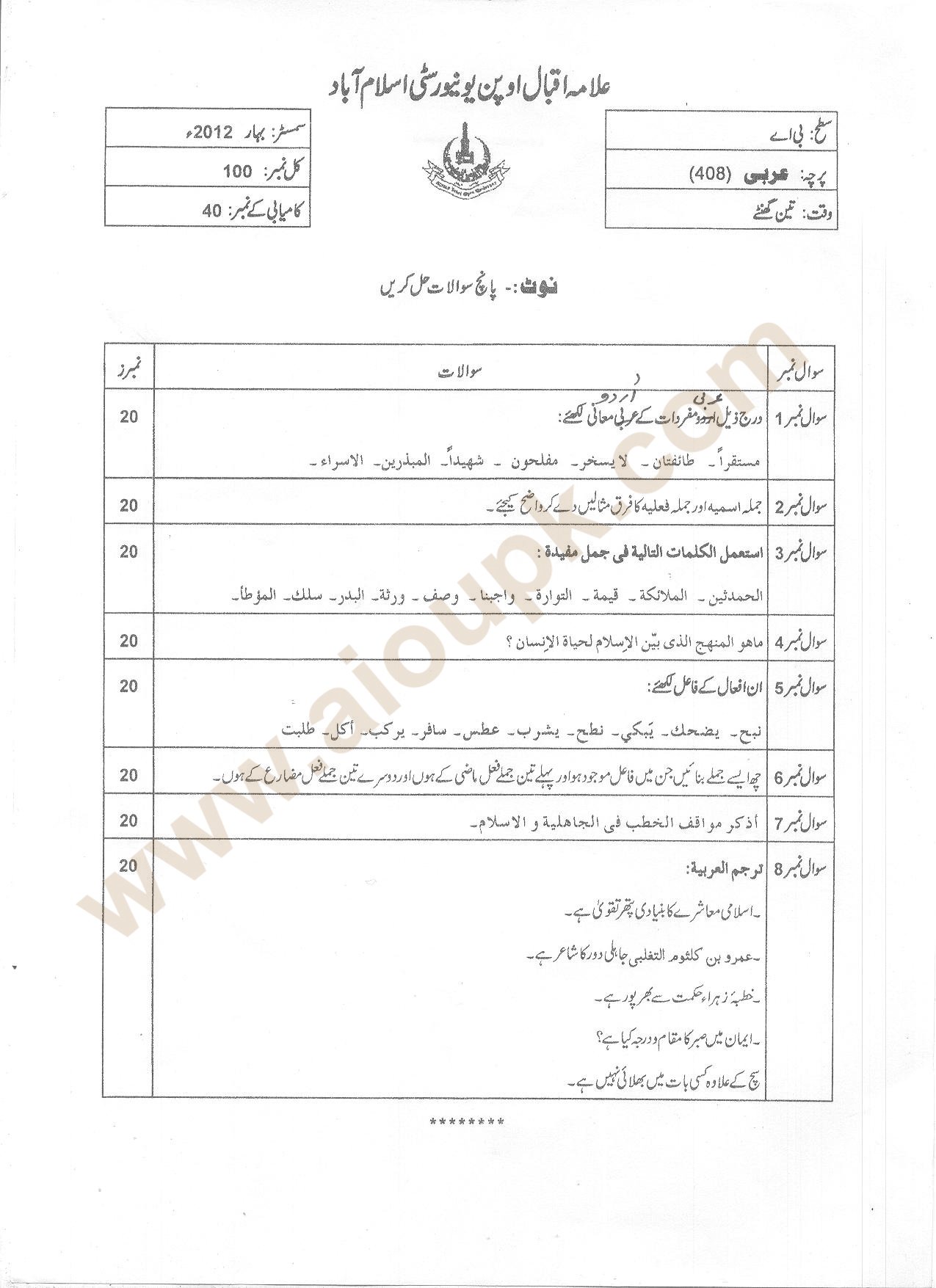 Arabic Code 408, Program : Bachelors AIOU Old Paper B.A Spring 2012