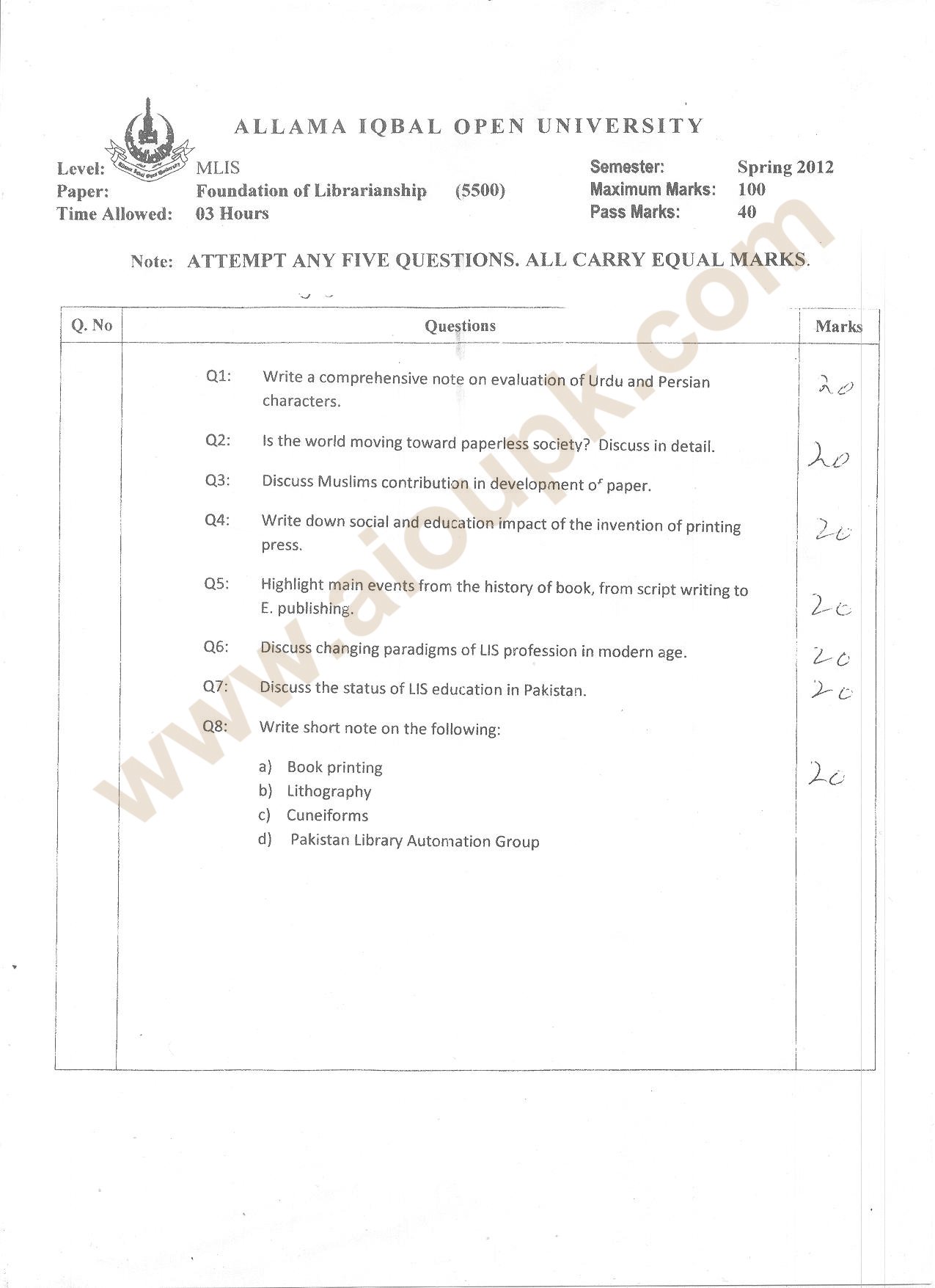Past Papers of Allama Iqbal Open University for MLIS Programs
