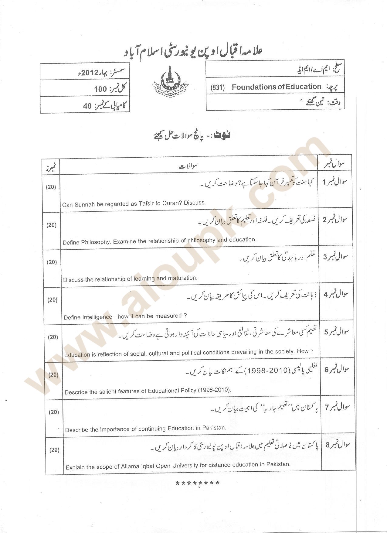Past Papers / Sample Guess Paper of Post Graduate Programs (AIOU) Allama Iqbal Open University