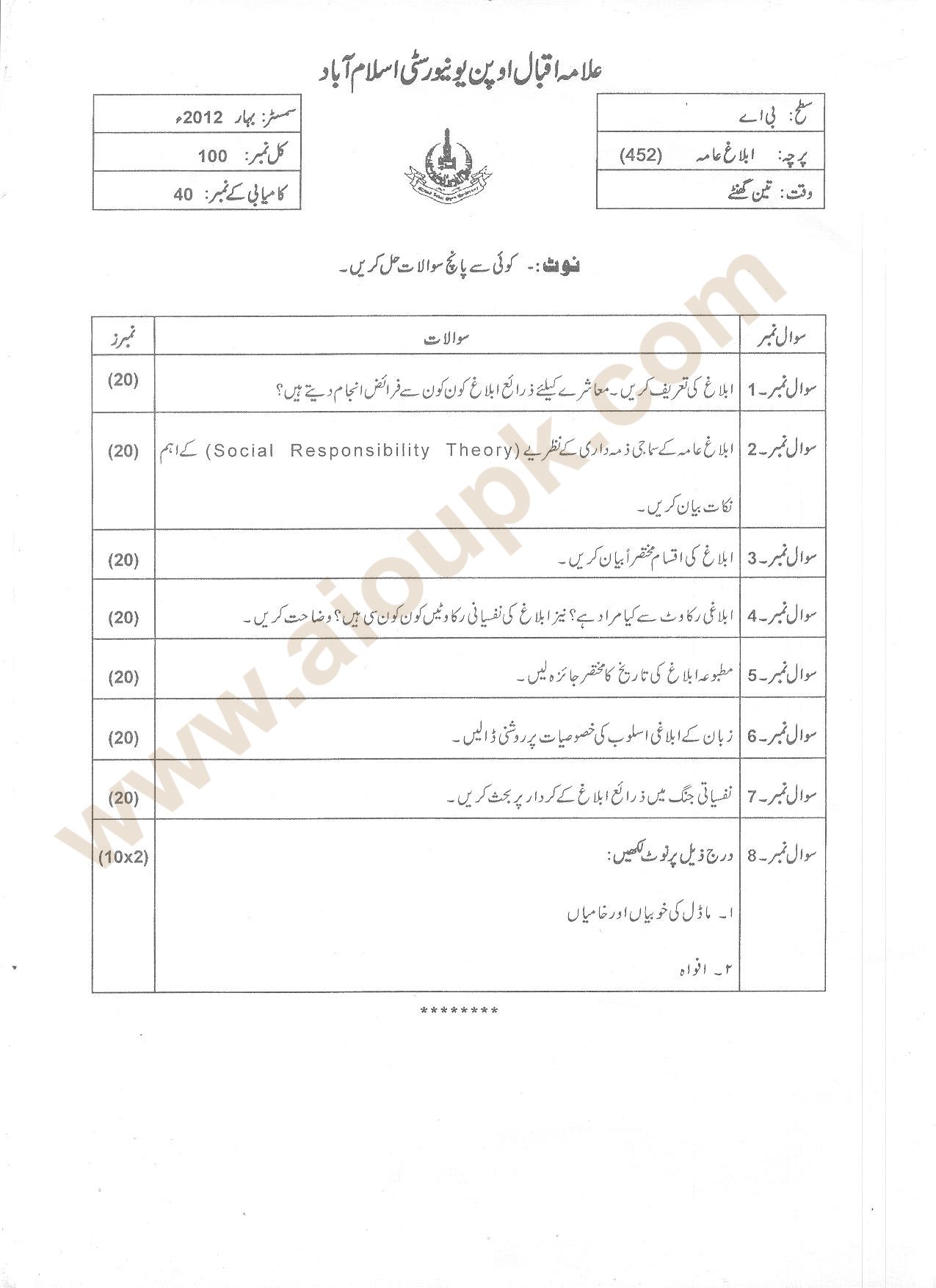 Mass Communication Code 452 Level : Bachelors B.A, AIOU Old Paper Spring 2012By aioupk / October 21, 2013 Allama Iqbal Open University Past Papers Course / Subject : Mass Communication (Iblagh-e-Aama) Code : 452 Level : Bachelors (B.A) Semester : Spring 2012