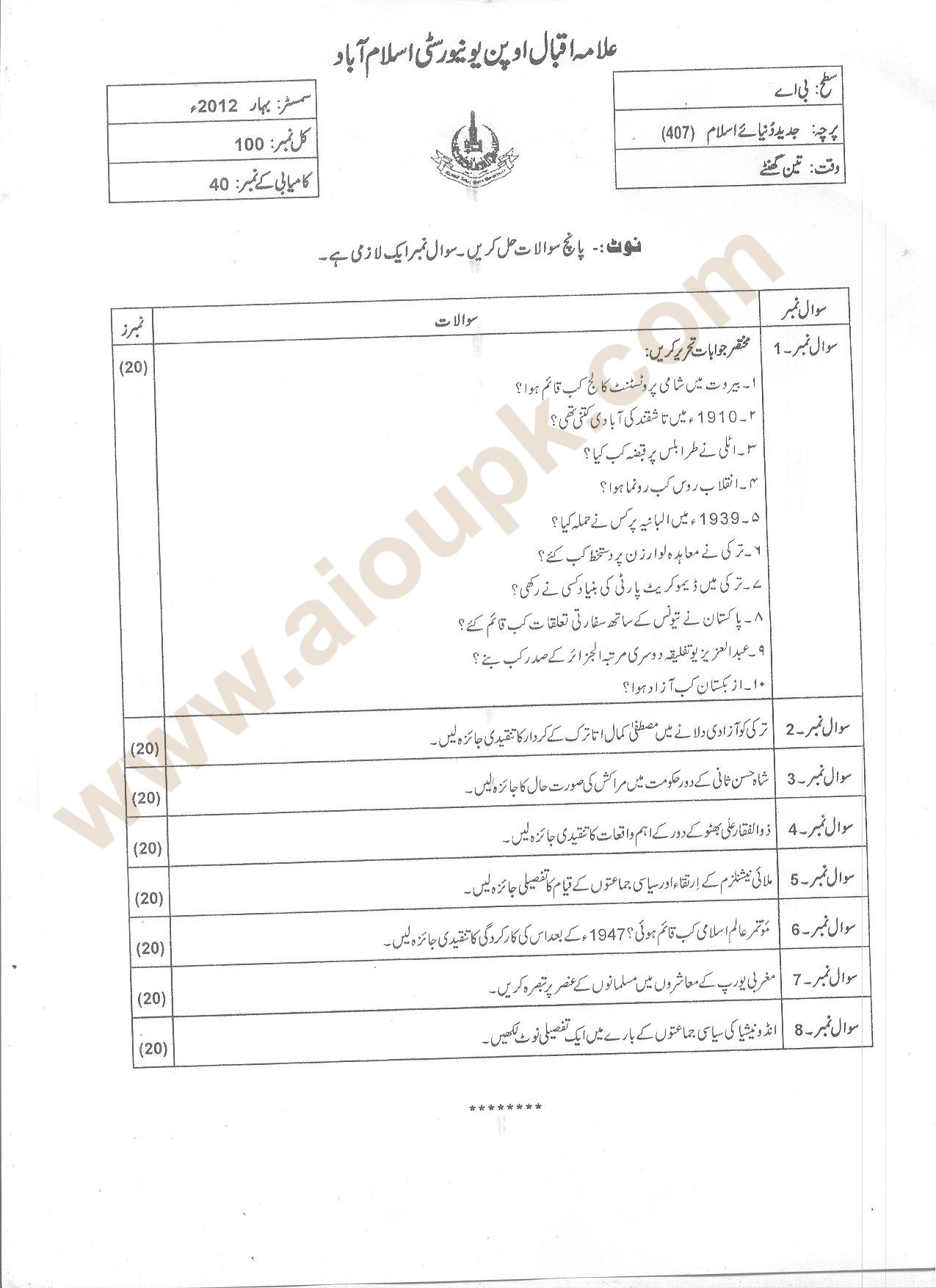 Modern Muslim World Course Code : 407 Program : Bachelors BA Old Paper, Guess PaperBy aioupk / October 19, 2013 Allama Iqbal Open University (AIOU) Past Papers Course / Subject : Modern Muslim World Course Code : 407 Level : Bachelors (B.A) Semester : Spring 2012