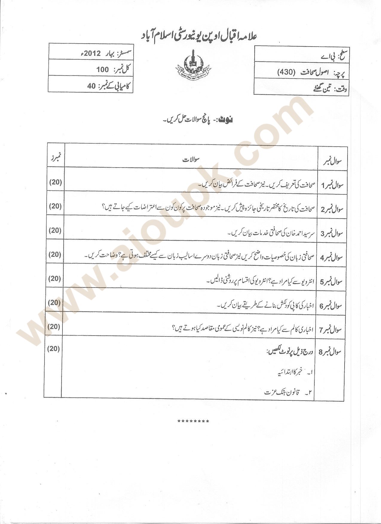 Principles of Journalism Code 430 Program Bachelors B.A , Old Paper of AIOU Spring 2012By aioupk / October 21, 2013 Allama Iqbal Open University Past Papers Course / Subject : Principles of Journalism Code : 430 Level : Bachelors (B.A) Semester : Spring 2012