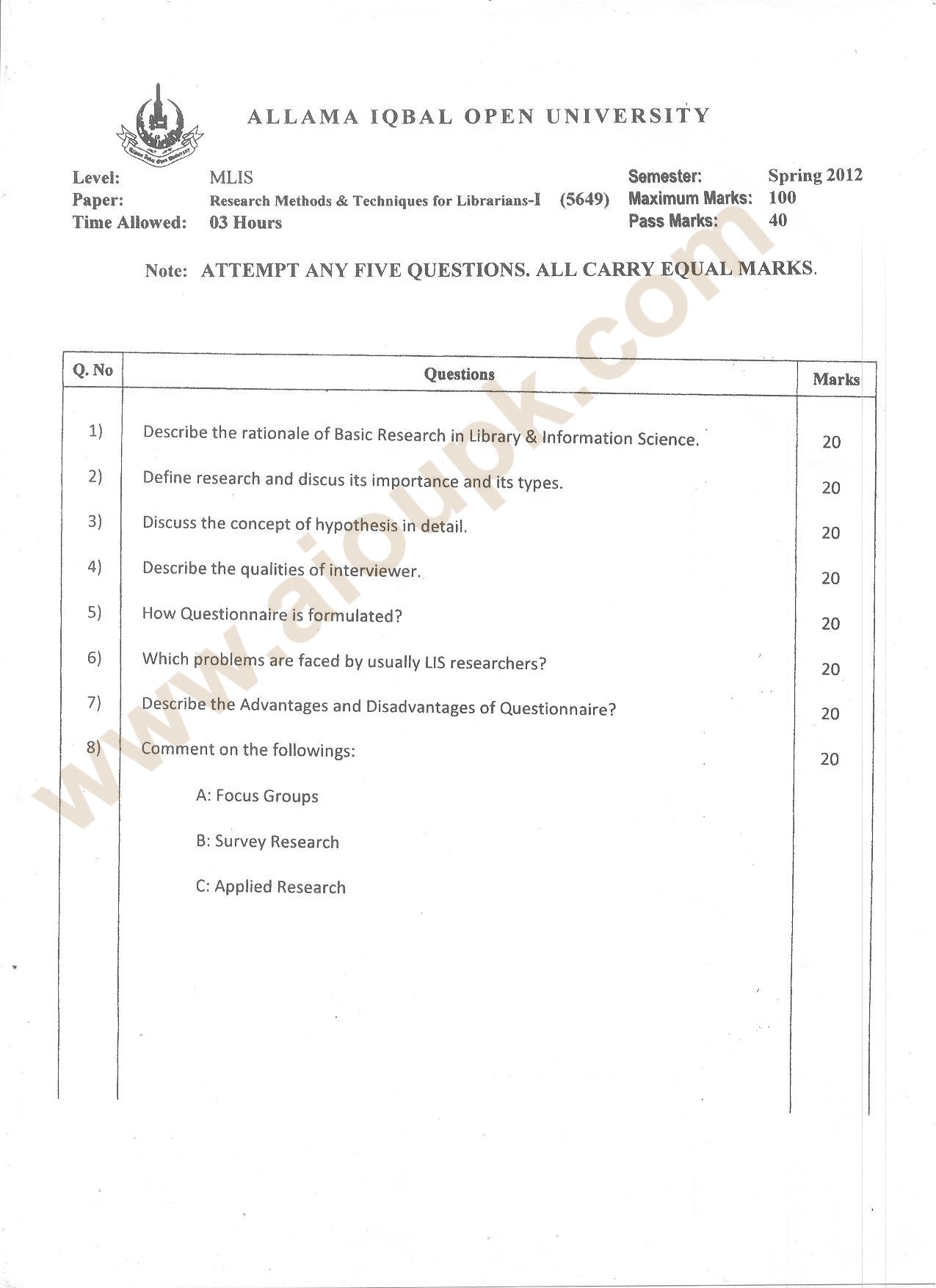 Past Papers of Allama Iqbal Open University (AIOU), Islamabad for MLIS Programs