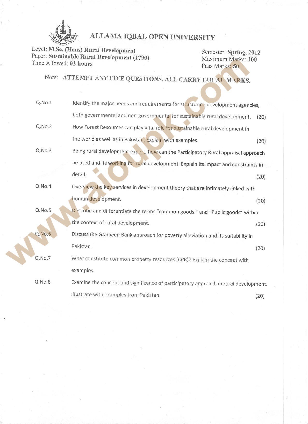 Sustainable Rural Development Code 1790 Level M.Sc (Hons) , AIOU Old Paper